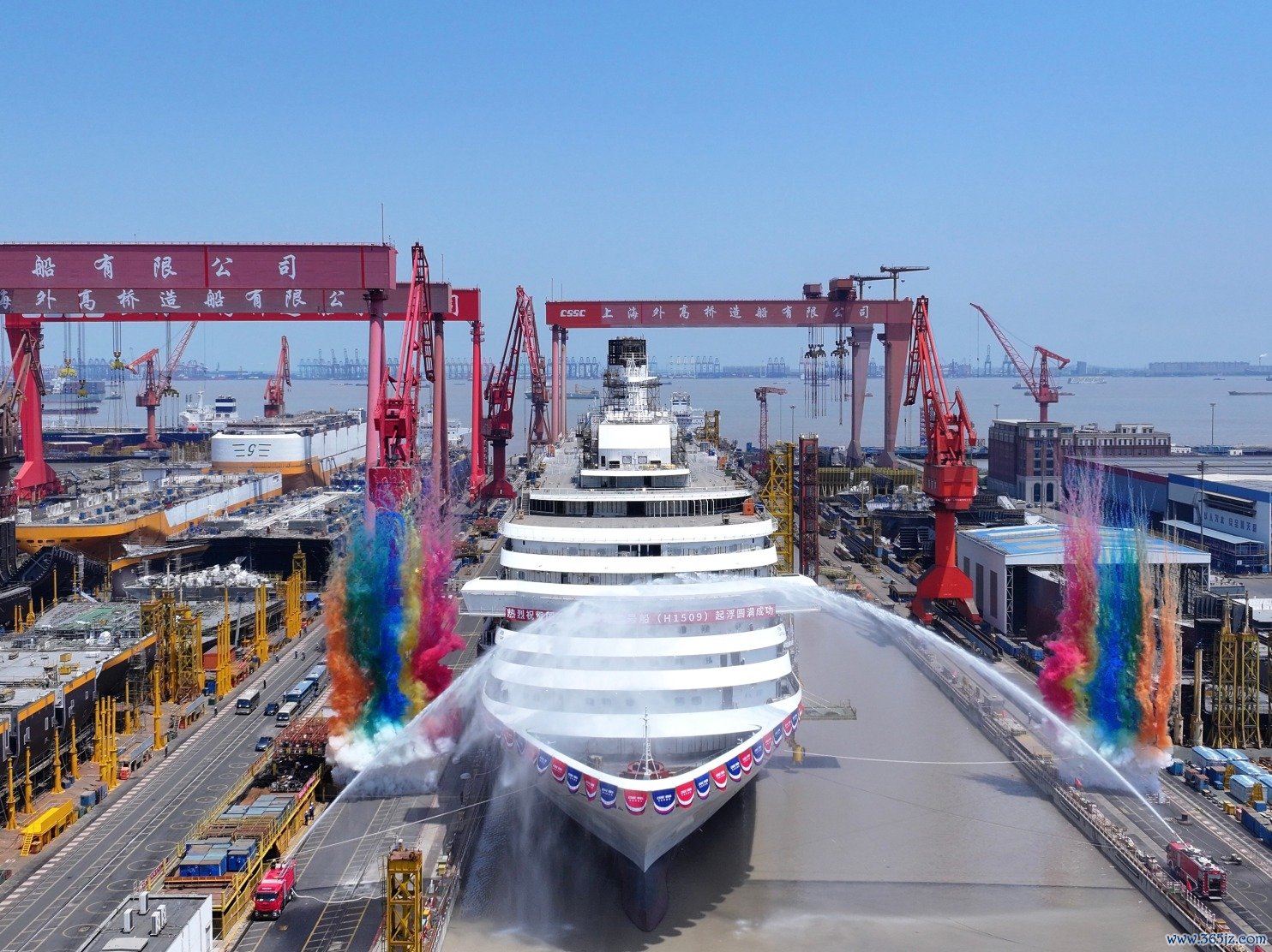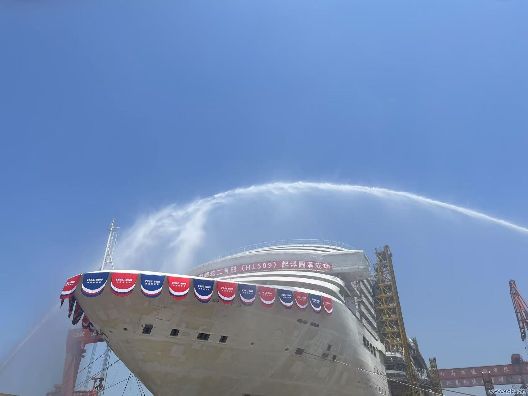 第二艘国产大型邮轮“爱达· 花城号”(H1509)顺利实现坞内起浮。外高桥造船供图