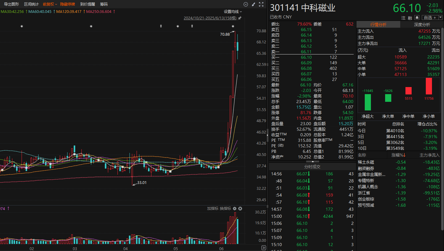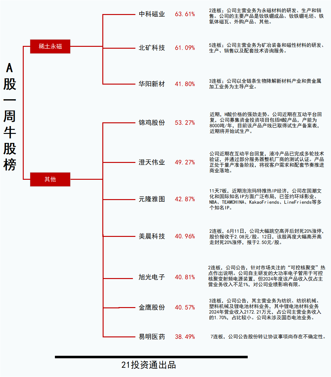 二级市场方面,近期稀土永磁板块上涨,近一周概念板块涨近5%。前十大牛股榜单中,中科磁业、北矿科技、华阳新材均为稀土永磁概念股。具体看最牛股,经过6月10日、11日20CM二连板后,6月12日,中科磁业股价继续上涨。截至当日收盘,中科磁业上涨3.20%,收盘价为68.13元,盘中股价最高触及70.88元,股价创历史新高。