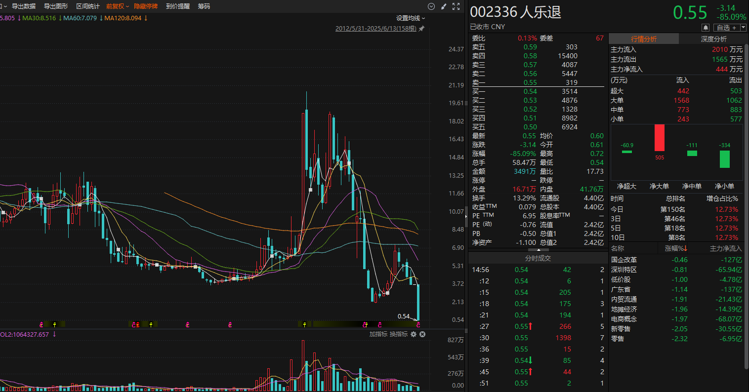 6月13日,人乐退进入退市整理期,跌幅超过85%,成交量较此前交易日急剧放大,今天是该公司股票进入退市整理期的首日。在股价暴跌后,公司最新市值已不足3亿元。